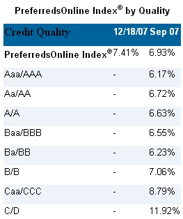 I would expect the Fed to lower rates, at the least, another 100 – 125 basis points over the course of the next six months. If that occurs, that would bring the funds rate down to around 3.00% from its current level of 4.25% assuming a full 125 point decline. The U.S. Treasury ten year note would likely fall in yield to around 3.5 – 3.75%. Those are pretty paltry yields in comparison to today’s 6% and 7% yields on AAA/BBB corporate preferreds, 7% yields on BBB utility preferreds, and 8% and 9% yields on REIT preferreds.As well, as the economy steers clear of running aground in 2008, fears of rising defaults will subside lifting fixed income prices.