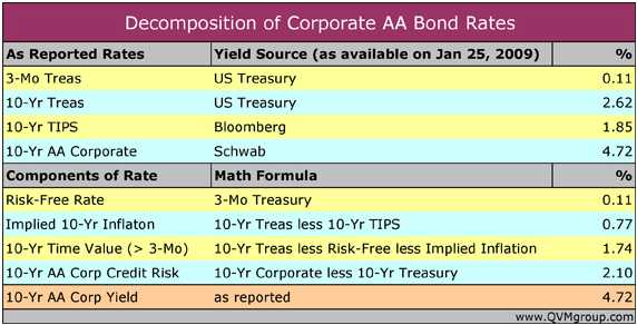 From the table above, you can see that the implied 10-year annualized inflation rate is 0.77%, and the credit risk component for 10-year AA corporate bonds is 2.10%.