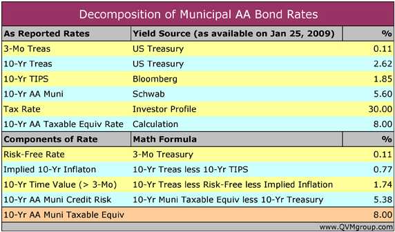 Right now, typical 10-yr AA municipal bonds are paying a taxable equivalent of 8.00% for 30% tax bracket investors, which translates to 5.38% for the credit risk component.