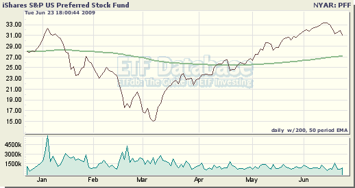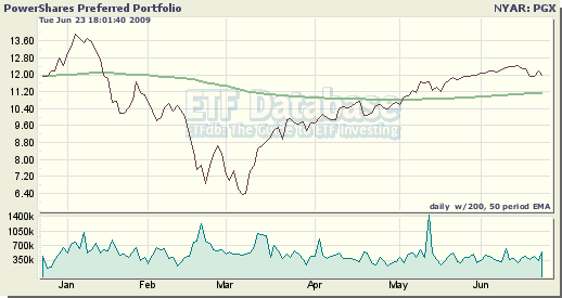 - PowerShares Financial Preferred Portfolio (PGF): This ETF, which tracks the Wachovia Hybrid & Preferred Securities Financial Index, focuses exclusively on preferred issues from financial institutions and maintains approximately 30 holdings. Since the bear market low in March, PGF has risen by more than 170%, boosted by significant improvements in the banking sector that have reduced the likelihood of widespread bankruptcy filings.