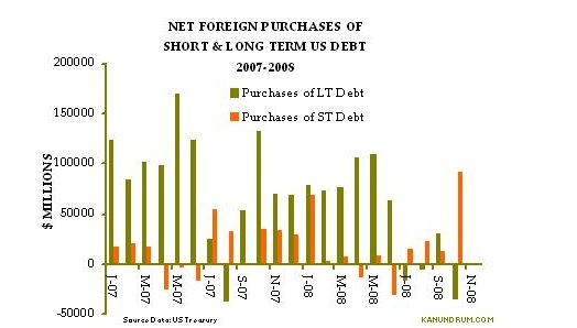 In October, foreigners sold $34 billion of long-term treasury securities, whilepurchasing $92 billion of short-term treasuries. The treasury has kept tabs on foreign purchases of U.S. debt since 1978 and the amount of long-term securities sold in October 2008 was second only to August of 2007 when foreigners sold $37 billion. But, foreigners bought short-term securities so all is well, right?