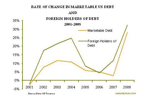 In October, as part of the Emergency Economic Stabilization Act, the Congress approved a debt limit increase to $11.3 trillion. Currently the national debt stands at $10.6 trillion. If the U.S. maxes out its credit line (a highly likely scenario) that would translate into a 7% increase in debt outstanding. Since foreigners are not the only buyers of U.S. debt, someone will have to fill that gap, especially if the decline in foreign ownership continues. The trillion dollar question is, will the new buyer agree to the same 0% terms that the current buyers are receiving?